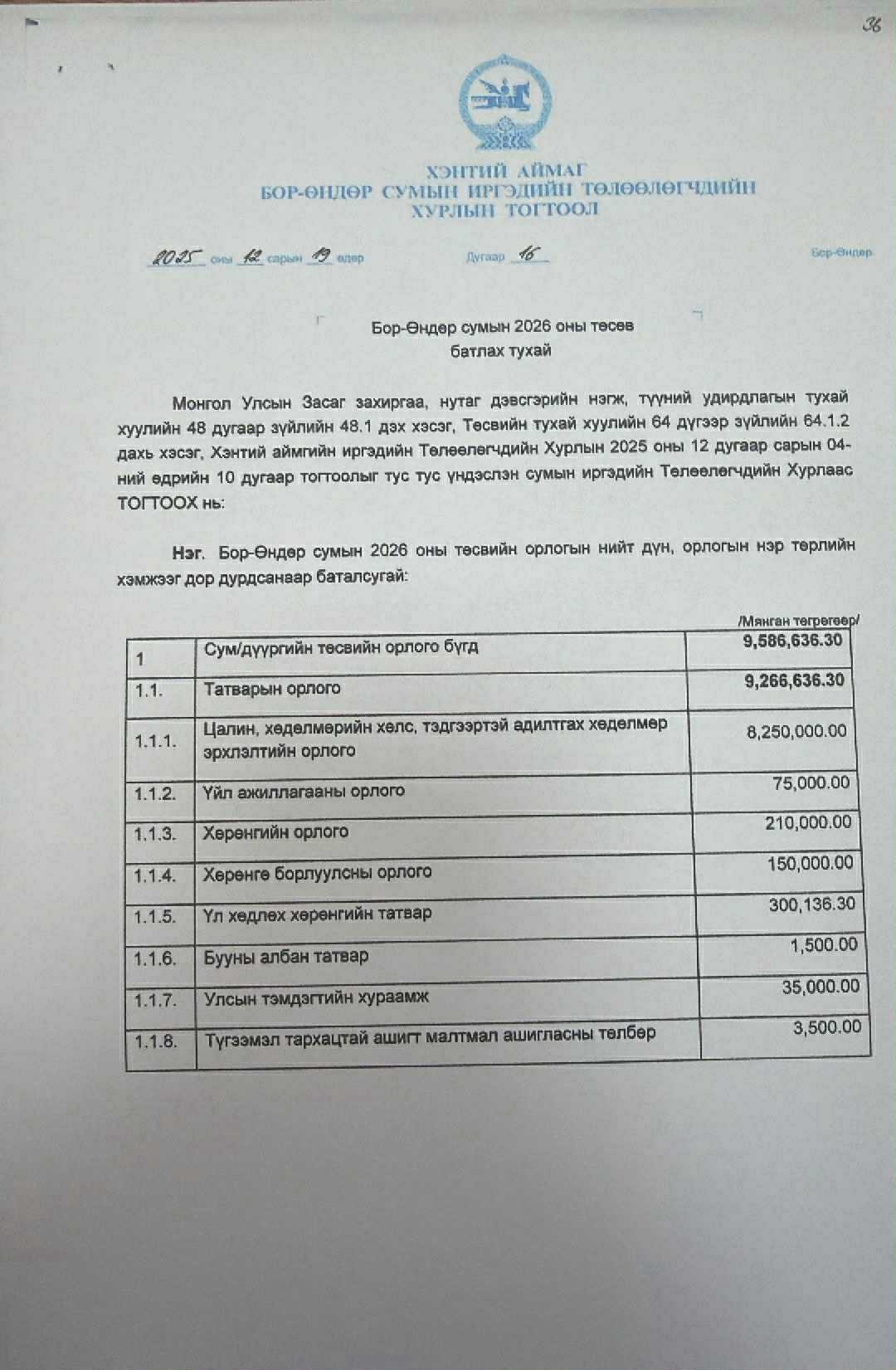 Бор-Өндөр сумын 2026 оны төсөв батлах тухай